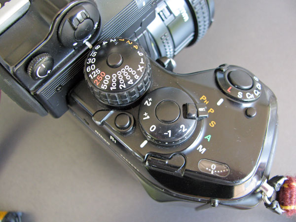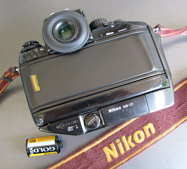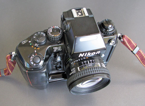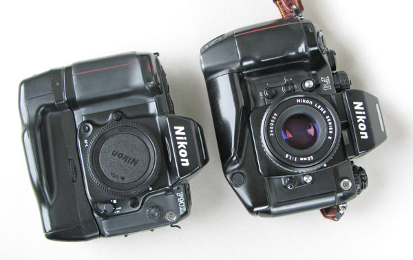 Nikon F4s mit MB-21, Weitwinkel Nikkor 20mm, Tragegurt und sechs Akkus: 1,741 kg zeigt unsere Küchenwaage an, etwas gar viel des Guten. Die abgebildete Kamera ist zur Zeit nicht brauchbar: sie löst nicht aus, und der Rückspul-Motor tut sich schwer. Schade einerseits, andererseits habe ich den Body für einen vergleichsweise bescheidenen Preis gekauft, damit ich wieder einmal eine Lücke der Nikon-Spiegelreflex in meiner Sammlung schliessen kann. Das Kleingeld halt ... Nikon F4: „Gross, schwer, kompliziert und teuer. Warum sollten wir lügen?“ „Warum sollten wir lügen?", monierte Nikon in einer doppelseitigen GEO-Werbung im Jahre 1991. „Die Nikon F4 ist mit Sicherheit nicht jedermanns Sache. Aber das kann eine echte Profikamera auch nie sein. Denn als solche muss sie alles haben, was ein Berufsfotograf jemals brauchen könnte. Dazu gehört nun einmal die umfangreiche Technik, die auswendige Mechanik, die hochwertigen Materialien und die nahezu unbegrenzten Erweiterungsmöglichkeiten. Und nur deshalb ist eine F4 ein wenig teurer als andere." Und ein Jahr zuvor Nikon-Werbung: „Aussen Giugiaro. Giorgio Giugiaro ist Designer. Und zwar einer der besten. Einer, dessen Ideen immer wieder einmalige Formen angenommen haben, die sowohl durch ihr Äusseres als auch durch ihre Funktionalität überzeugen. Seine jüngste Arbeit für uns ist die Nikon F4. Wahrscheinlich war es einer seiner schwierigsten. Drei Jahre dauerte es vom Plastilin-Modell bis zur fertigen Kamera. Drei Jahre, in denen eine grosse und komplizierte Kamera entstanden ist, die nicht nur gut aussieht, sondern auch handlich und begreiflich ist. Und die deswegen eine echte Nikon ist." Man vergleiche die Grösse des KB-Filmes und F4s mit Motor MB-21. „Neben dem Motor für die Entfernungseinstellung der Objektive besitzt die F4 noch drei weitere Motoren, einen für die Spannung des Verschlusses und die Steuerung der Spiegelbewegung, einen für den Filmtransport und einen weiteren für die Filmrückspulung." Mehr in der Nikon-Story von Peter Lausch >>> http://www.lausch.com/zwoelfterteil.htm Wikipedia-Ausschnitt: "Die Nikon F4 war die erste echte Profikamera von Nikon mit einem integrierten Autofocus-System, und die zweite Profikamera von Nikon mit Autofocus nach der F3AF. Sie sollte bei Ihrer Einführung 1988 die Nikon F3 ablösen (die jedoch aufgrund von Nachfrage bis ca. 2003 weiter gebaut worden ist). Die von dem italienischen Designer Giorgio Giugiaro gestaltete F4 stellte einen größeren Fortschritt dar als die vorherigen Sprünge von der Nikon F zur F2 und zur F3, da sie außer Autofokus auch einen eingebauten Motorantrieb, einen deutlich schnelleren Verschluss und komplexe Belichtungsmessfunktionen aufwies. – Im Vergleich zur semi-professionellen Nikon F801 konnte die Autofocus-Geschwindigkeit noch einmal gesteigert werden. Der Autofocus der F4 verfügt auch über eine automatische Schärfenachführung, die bei sich auf die Kamera zu- oder wegbewegenden Objekten die Scharfstellung des Objektives so berechnet, dass die optimale Schärfe in dem Moment erreicht wird, wenn der Spiegel bereits hochgeklappt ist und der Verschlussvorhang sich bereits öffnet. Auch in Sachen Ausstattung hatte die F4 der F801 einige Ausstattungsmerkmale voraus, dazu zählen vor allem der Wechselsucher und die Spotmessung. Allerdings wurde bald darauf die Nikon F801s vorgestellt, die ebenfalls über Spotmessung verfügte." Weiter auf Wikipedia, inklusive Daten >>> Oben und unten: Schon möglich, dass alle Hebelchen und Knöpfe dort angebracht sind, wo der Profi sie sucht. Die erwähnte F801 und die verbesserte F801s waren auch von guten Eltern, kosteten viel weniger und waren wesentlich leichter zu handhaben. Das Nachfolgemodell F5 und die kleine Schwester F100 sind eh vorzuziehen. Nun, die Geschmäcker sind verschieden ... wie vielleicht auch die Anforderungen. Gehäuse ohne (auswechselbaren) Sucher Die F4, F4s oder F4e "verkraften" wie viele andere Nikons auch uralte Nikkore oder Fremdobjektive, ein Konstruktionsmerkmal, das hoch zu schätzen ist. Ach, war da was mit Gewicht und Grösse? Jetzt ist mir gerade noch eine Nikon F90x (links) in die Hände geraten; die war bei preisbewussten anspruchsvollen Amateuren sehr beliebt.