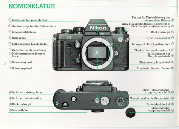 F3 HP mit MD-4: Unverwüstliche Qualität, bis zu sensationellen sechs Bildern/secMotorantrieb Aus der Betriebsanleitung Eines der aufregendsten neuen Zubehörteile für die F3 ist der Motorantrieb MD-4. Dieser erstaunlich kompakte und formschöne Antrieb kann in Sekundenschnelle am Kameraboden angebracht werden; er transportiert den Film entweder Bild um Bild oder in der schnellen Folge von 6 Bildern pro Sekunde*—damit ist er der schnellste serienmäßige Motorantrieb, der heutzutage im Handel erhältlich ist. Für Bedienungskomfort wurde er nur mit unbedingt erforderlichen Bedienungselementen ausgestattet. Äußer dem elektromagnetischen Auslöser (der auch den Belichtungsmesser der Kamera einschaltet, wenn er halb niedergedrückt wird) sind ein konzentrischer Betriebsartenwähler für Einzelbild- oder fortlaufenden Transport, ein Batterieprüfknopf und Leuchtdiodenanzeigen sowie zwei verriegelte Rückspulschieber für automatische Filmrückspulung vorhanden. Dazu kommt noch ein rückwärtszählendes Bildzählwerk für Verwendung bei kaltem Wetter, das den Motor an der gewünschten Bildzahl abstellt. Acht Stabbatterien der Größe AA können in einen schnell herausnehmbaren Behälter eingesetzt werden, der im Unterteil des Motorantriebs untergebracht ist. Ein NiCd-Akku ist als Sonderzubehör für Verwendung bei kaltem Wetter bzw. für schnellstmöglichen Filmtransport erhältlich. Nach Ansetzen des MD-4 an Ihre Kamera möchten Sie ihn einfach nicht mehr abnehmen. * Mit NiCd Akku MN-2 bei 1/125 sec oder kürzer und hochgeklapptem Spiegel möglich. In Kombination mit einem günstigen Normalobjektiv der Serie E, das aber einen guten Ruf hat