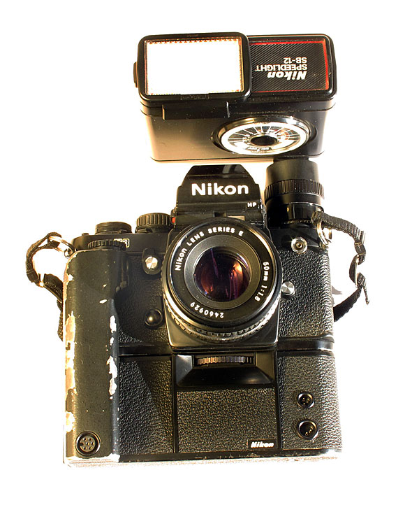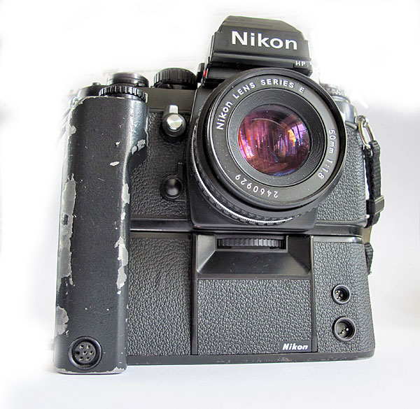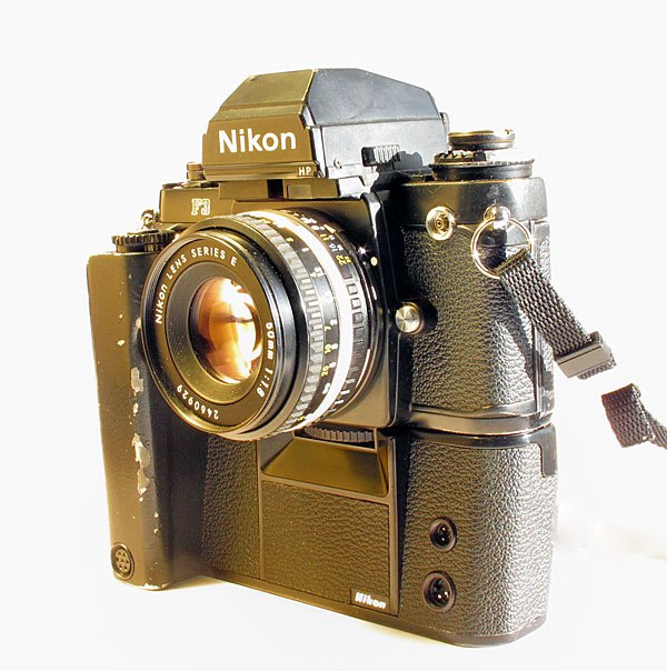F3 HP mit besserem Sucher und Motor, der unverhältnismässig gross und schwer ist, aber bis zu sechs Aufnahmen in der Sekunde ermöglicht, was für die damalige Zeit sensationell war. Wie die Kamera behandelt wurde, kann man am Griff ablesen.