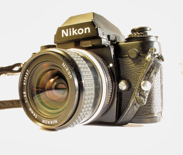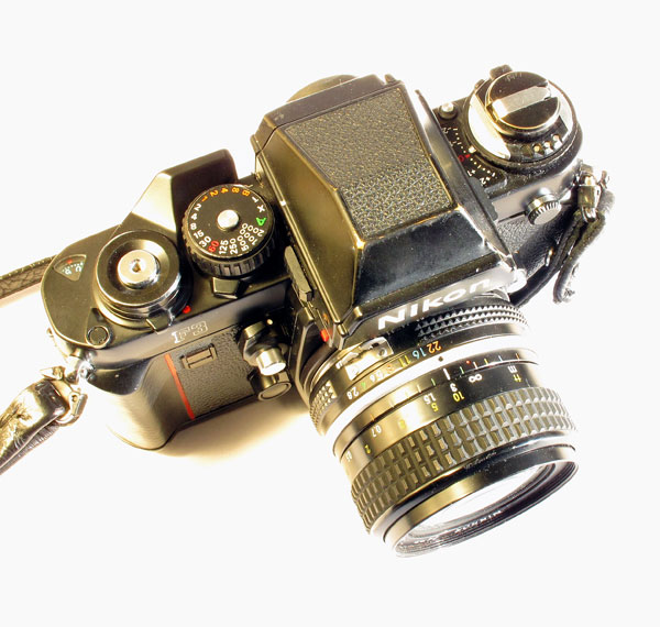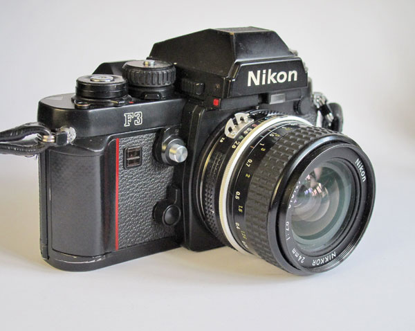 Meine F3 mit Normalsucher und einem Weitwinkel-Nikkor 24mm, eine verhältnismässig zierliche Kamera. Ganz anders sieht das aus, wenn man einen Motorantrieb anschliesst. Siehe weiter unten.