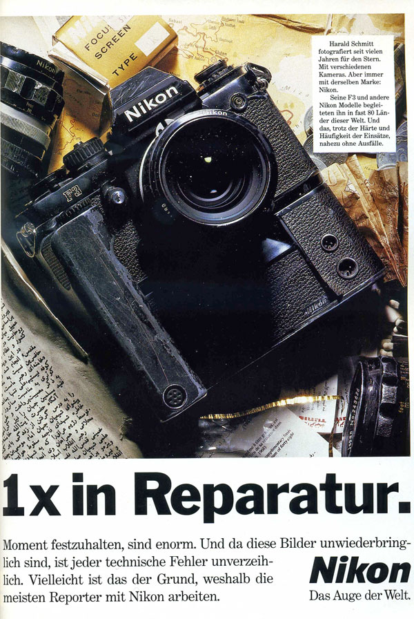 «Die F3 war bei ihrem Erscheinen ein absoluter Renner. Die Zeitautomatik, das Flüssigkristall-Display, die Belichtungsmessumg im Cameragehäuse, Blitzmessung, das alles waren Features, die damals die Nikon-Fans begeisterten. Das Profigerät der 80er-Jahre zu besitzen, mit der Möglichkeit die Sucher zu wechseln und Anschluß an das riesengroße Nikonsystem zu haben, damit erfüllte ich mir einen langegehegten Traum, der mich damals gleich ein paar Monatsgehälter kostete.» Der1zigWahre