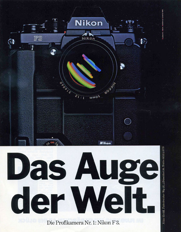 «Was sich bei der F2 schon andeutete, das findet hier seine Vollendung: Elektronik ersetzt Mechanik wo sie kann und wo es sinnvoll ist So ist die F3 ausgestattet mit einer automatischen Steuerung der Belichtungszeit bei Blendenvorwahl – mit der Zeitautomatik. Ihr Belichtungsmesser befindet sich nicht mehr im Sucher, sondern im Kameragehäuse. Ihr mittenbetontes Meßverfahren ist mit 80 Prozent Meßanteil auf die Bildmitte neu gewichtet Sie bietet zusätzlich einen Belichtungsmeßwertspeicher, eine separate Belichtungskorrekturschaltung und eine TTL-Blitzsteuerung, bei der die Kamera die Blitz- lichtmenge den Lichtverhältnissen entsprechend regelt. In einem solchen Maße technisch ausgereift, gibt es dann auch nichts Wesentliches mehr besser zu machen. So folgen nur noch 3 Modellvarianten, die sich einzig durch andere Sucher oder ein anderes Gehäuse von der Ur-F3 unterscheiden: Die F3 HP, die 1982 erscheint und deren Bezeichnung sich aus ihrem High-eyepoint-Sucher ableitet, durch den das Blickfeld auch aus einem Abstand von 25 Millimetern zum Okular übersehbar ist. Die F3 T, die 1983 mit einem titanverstärkten Gehäuse auf den Markt kommt. Und – ebenfalls 1983 – die F3 AF, die, mit dem ersten Autofokussucher der Welt ausgestattet, als erste F automatisch scharfstellt.» Nikon-Werbung