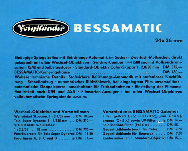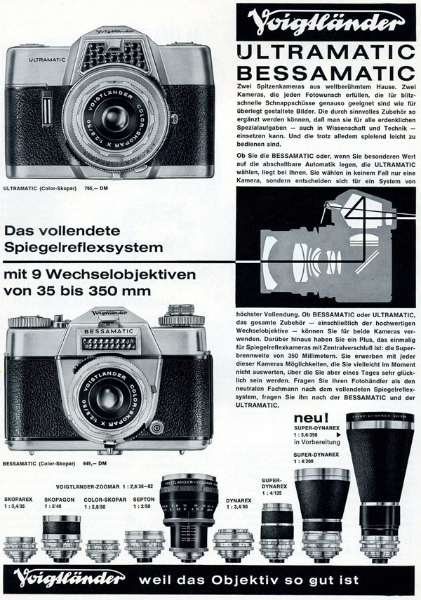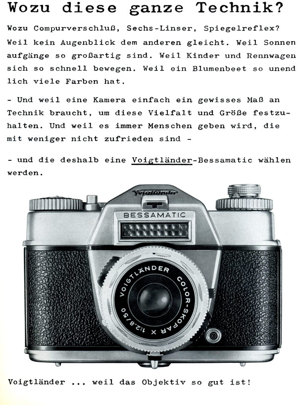"BESSAMATIC – das ist die neue Voigtländer Spiegelreflex mit den weiten Möglichkeiten ... die Kamera, die Ihnen zugleich die neue Art des lebendigen, dynamischen Fotografierens erschließt!