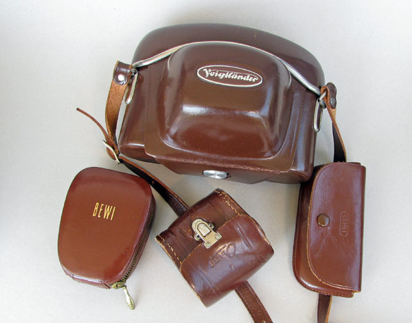 Die Bereitschaftstasche kostete 36 DM. Der Bewi-Belichtungsmesser hat den Geist aufgegeben, Filter und Vorsatzlinsen sind in den kleinen Ledertäschchen gut aufgehoben.