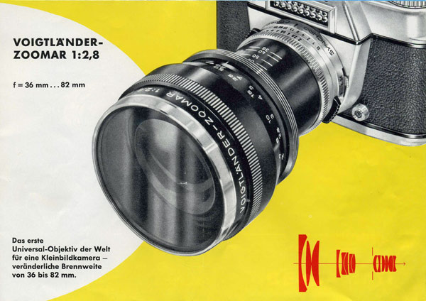 Zoomar (Betriebsanleitung): "Das erste Universal-Objektiv der Welt für eine Kleinbildkamera – veränderliche Brennweite von 36 bis 82 mm"