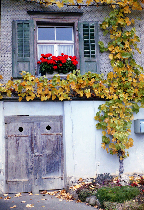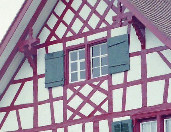 MIT AUSSCHNITT Eigene Aufnahme mit der Electro 35 und einem Colorfilm von Fuji mit 400 ASA. Unten ein Ausschnitt, ebenfalls auf eine Breite von 600 Pixel reduziert. Die stürzenden Linien sind nicht der Kamera anzulasten. Die Abbildungsqualität ist meiner Meinung nach verblüffend gut.