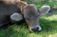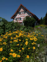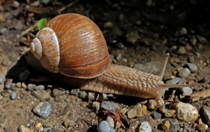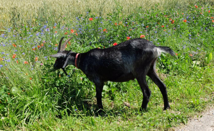 OBEN: Bauerngarten in Sitterdorf, Weinbergschnecke auf einer Waldstrasse, Verlockung für eine Capra Grischa